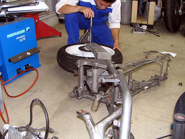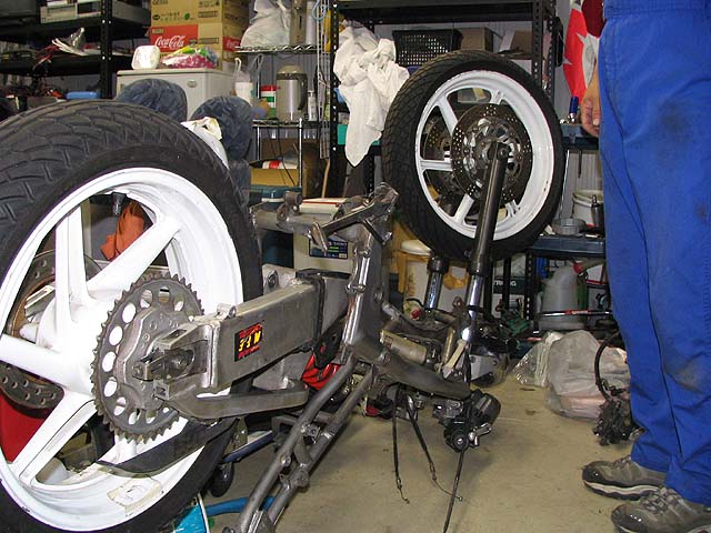CB−1の前後ホイールが帰ってきたので付けようとしたが、横倒しではうまく付けられない。
