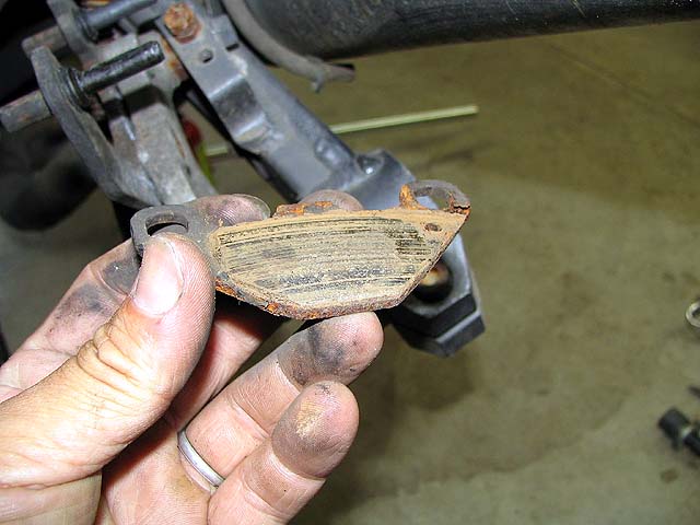 続いてリヤタイヤを外そうとしたらディスクが引っかかって外れなかった。パッドをチェックしたら斜めに減っている。