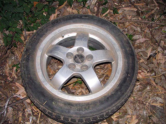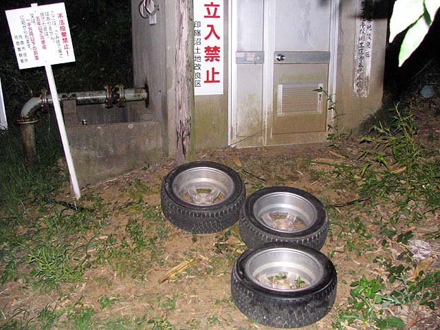 帰ろうとしたら、ガレージのすぐ近くにアルミホイールが4本不法投棄されていた。罰金1000万円!
