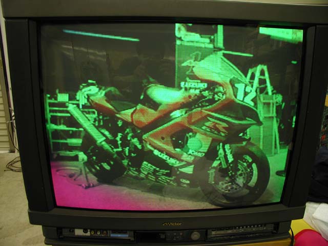 色がめちゃくちゃ。一様に緑で左下が紫。青の出力回路とデガウス回路の故障が考えられる。