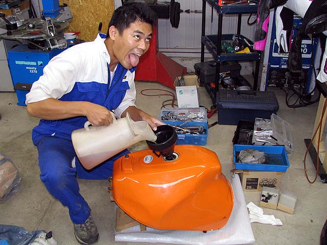 念のため容量をチェックする。ガソリン24L正確に計って注入。