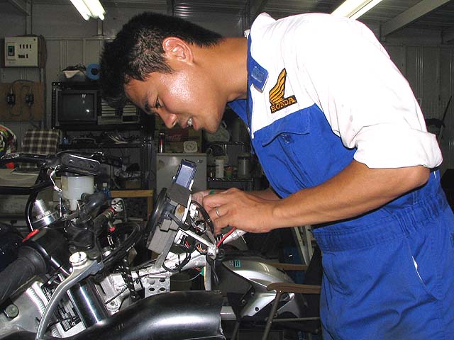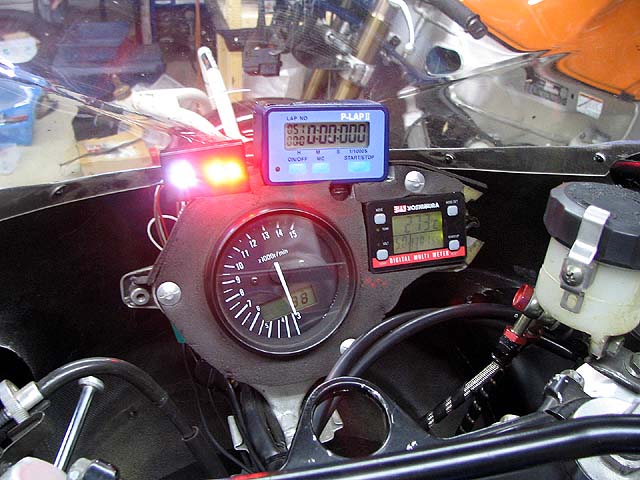 警告灯点灯の様子。左端の白いのはニュートラルランプ。直射日光下でもハッキリわるように超明るく光るようにしたのだが・・・