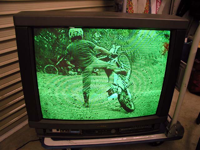 基盤を取り付けて画像をチェック。デガウスが働くようになって紫色の部分は無くなったが、画面は緑色。