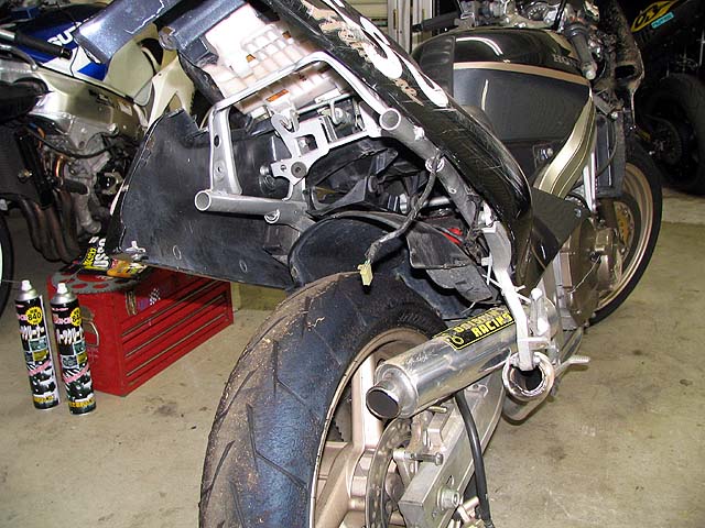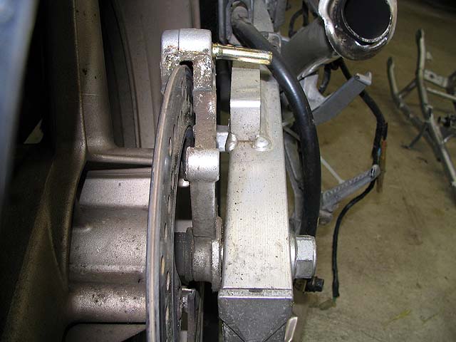 目視でスイングアーム、アクスルシャフト、キャリパーのサポートが曲がっているのがわかる。うーん思ってたよりも重傷だ。