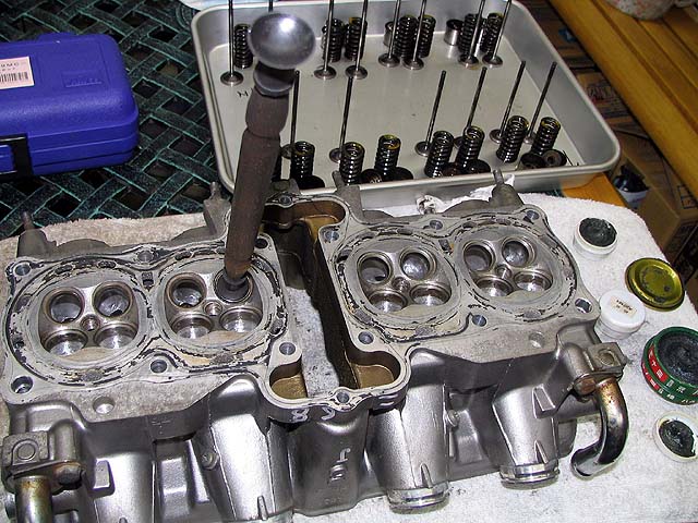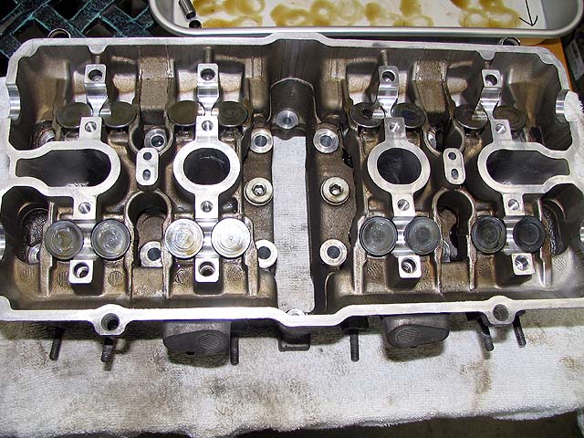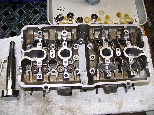 バルブガイドとリフターホールにオイルを流してからバルブをヘッドに組み付ける。