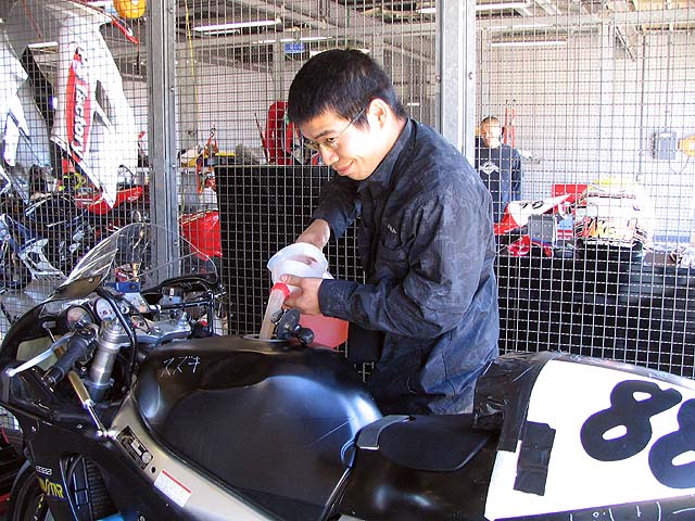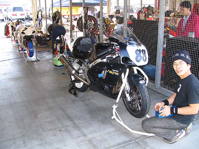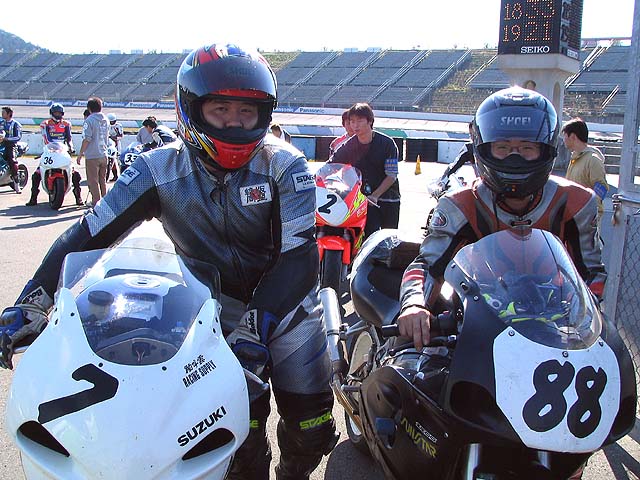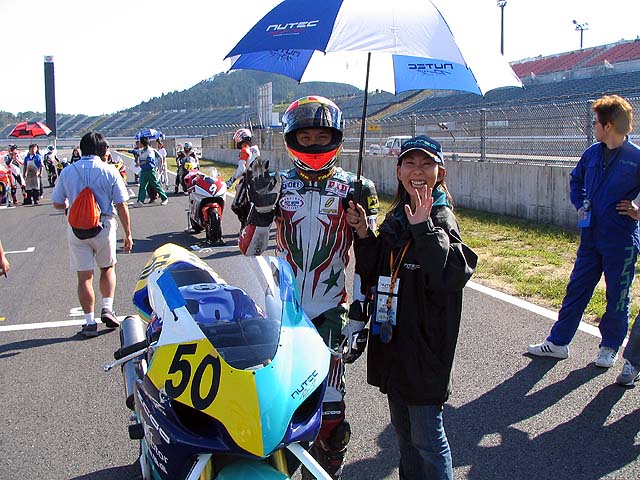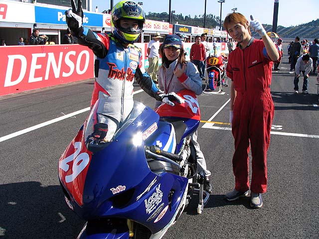 りんてんさん&リカちゃん。予選でオイルに乗って転倒してしまいましたがメカニックの懸命な修理で無事決勝走れました。