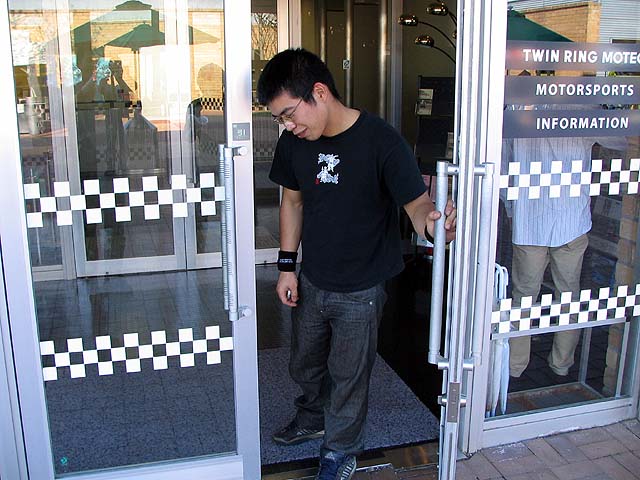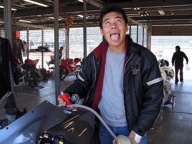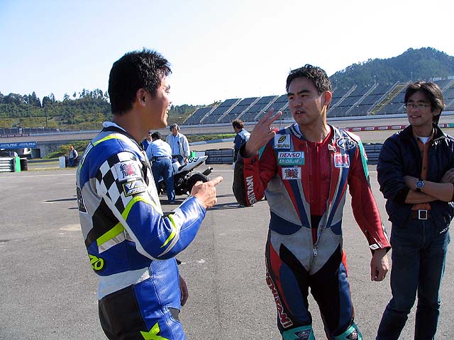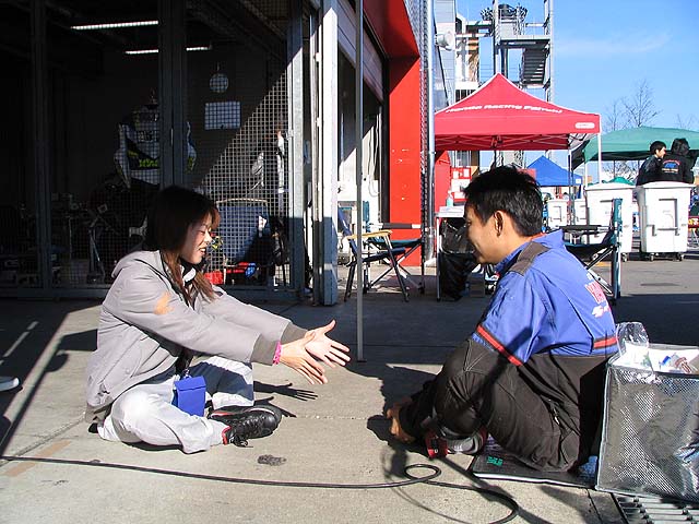 隣のピットのまこっち&ともっちさん。2人で仲良く柔軟体操。予選前でもピリピリせずに笑顔で楽しそうです。