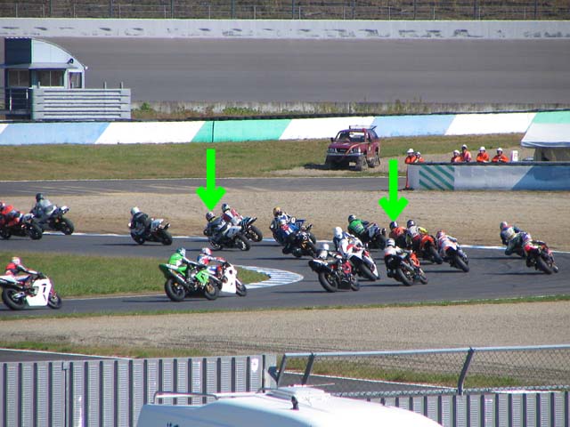 1周目の3コーナー。渋滞に巻き込まれるガチャプィンとツカッチ。