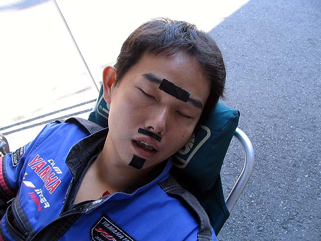 うあああ!誰かにイタズラされている!2分を切る凄腕ライダーも昼寝をしているときはタダのオッサンなのだった。