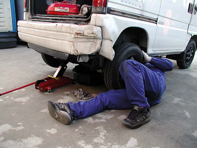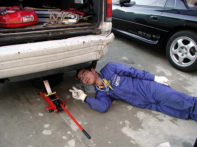 今日はつかっちが応援に来てくれました。CBRの整備を始める前にトランポの整備。オイル交換開始〜