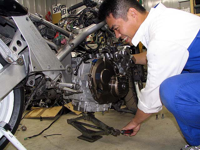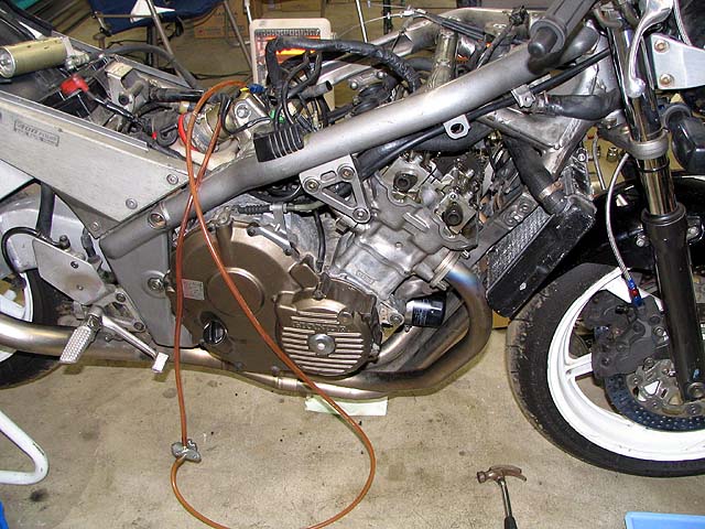エンジンを車体に搭載。マフラー付けてラジエーター付けてオイル入れて冷却水入れてエンジン始動。