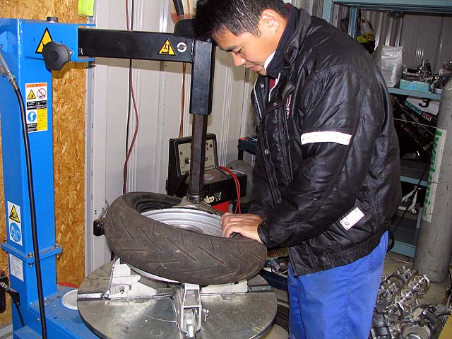 レギュレーションでタイヤサイズが前後120/80に指定されているのでフロントタイヤを100/80から交換。
