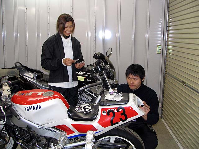 エミコちゃんとカズヤ君が手伝いに来てくれた。車体にゼッケンを貼ってもらう。