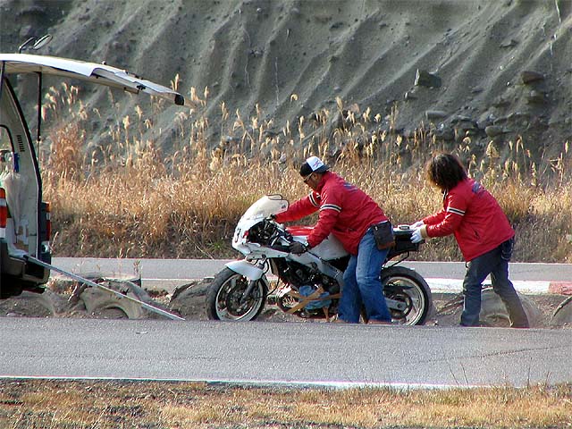 毎度お馴染みデスシーン。エミコチームFZRは1コーナーで転倒。エンジンに穴が開いてリタイヤ。