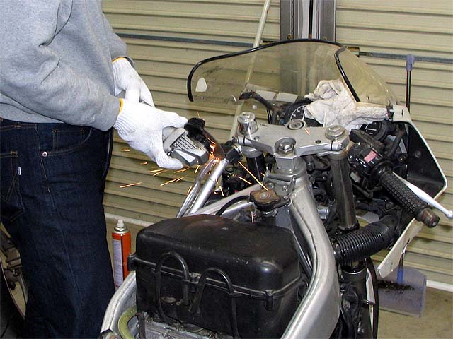 ハンドルを交換。クラッチレバーのホルダーを外すため、曲がったハンドルバーをサンダーで切断。
