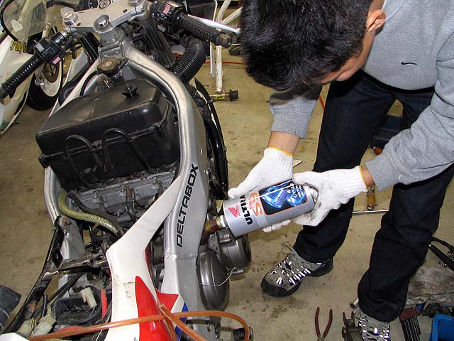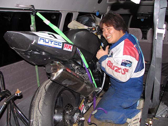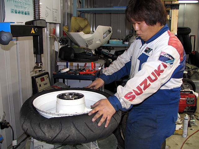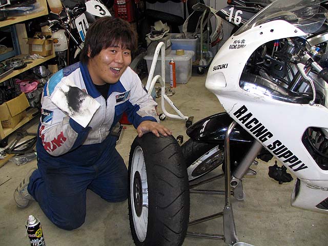 ガチャプィンが来てGSXR600の整備。26日にもてぎで練習走行するのだ。