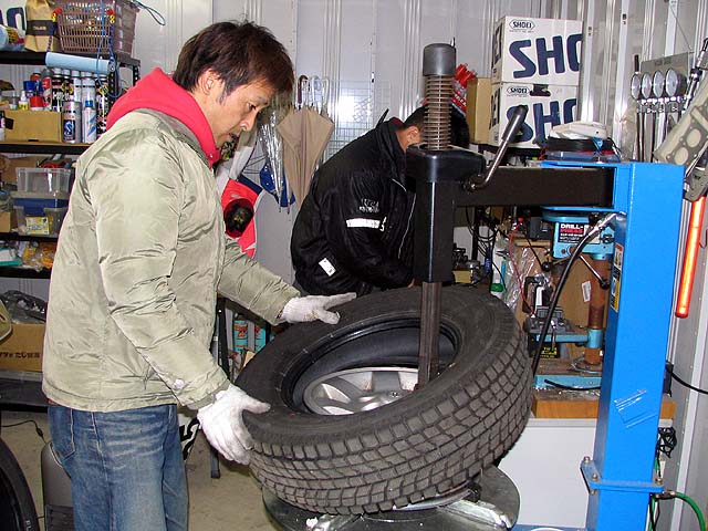 サトちゃんがタイヤ交換にきた。「チェンジャー壊すなよ〜」「誰かさんとは違うからダイジョ〜ブ。まかせとけって」
