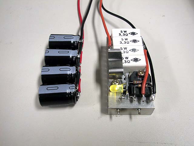 試作装置。左がコンデンサアレイ。右が今回新開発のシャントレギュレーターユニット