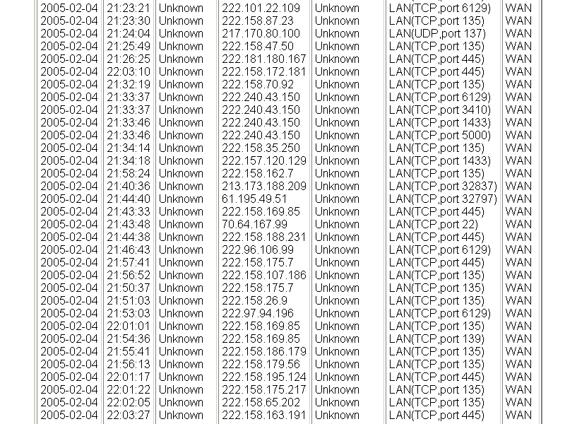 winole.exeがTCP135に攻撃、「DCOM RPCの脆弱性」を悪用して広まるらしい。自宅のファイアーウォールのログを見るとポート135へのアクセスが異常に増えている。MSブラスターの時と同じだ。