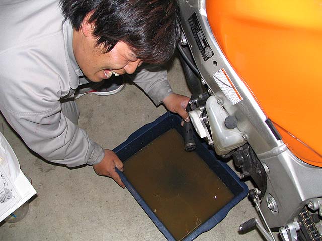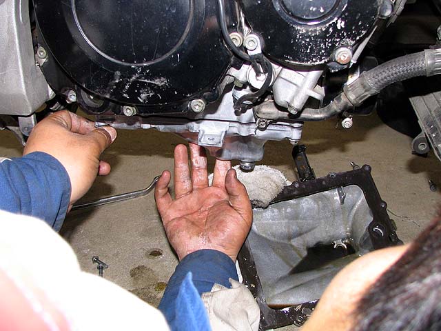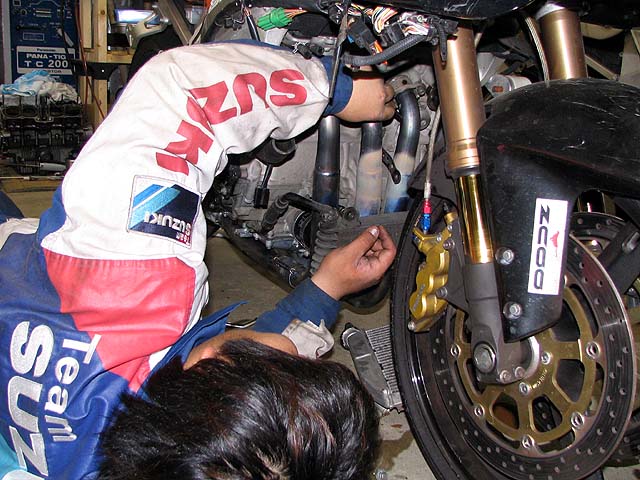 ガチャプィンがR1000の整備に来た。今日はオイルパンの交換をする。