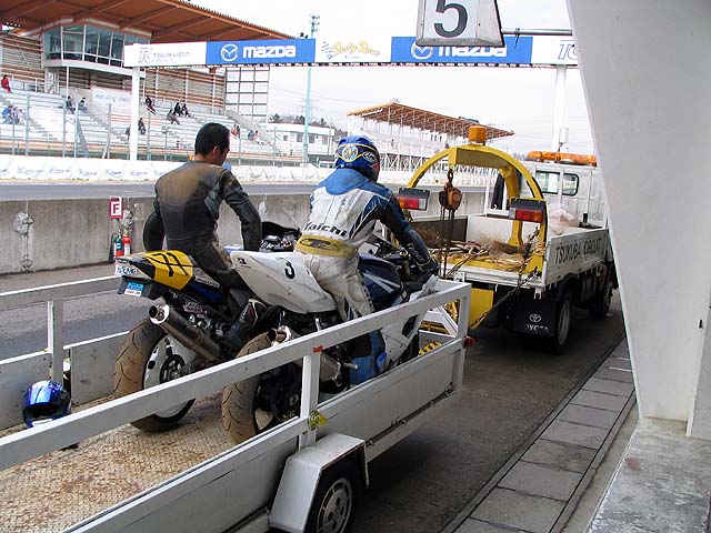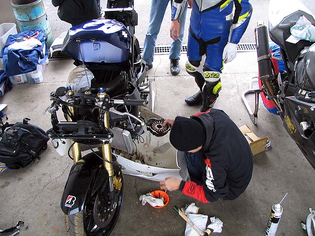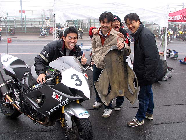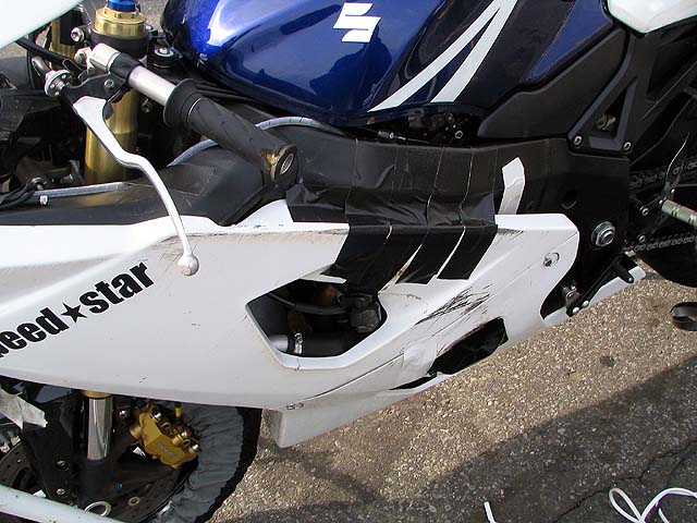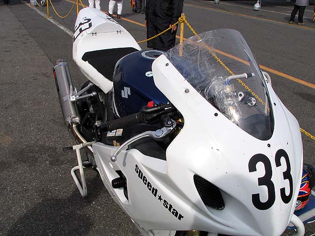 続いてGSXR決勝。バッチさんの懸命の修理で間に合った。スクリーンはセロハンテープ製。