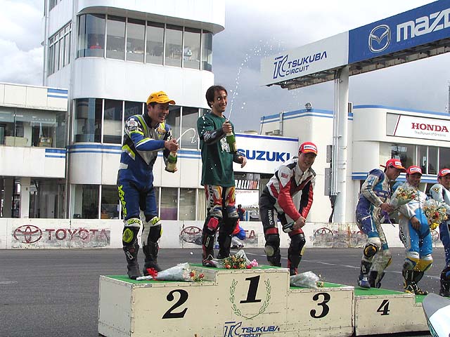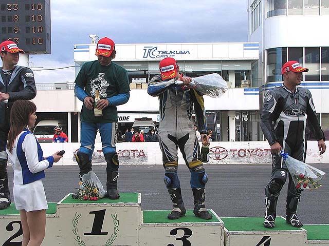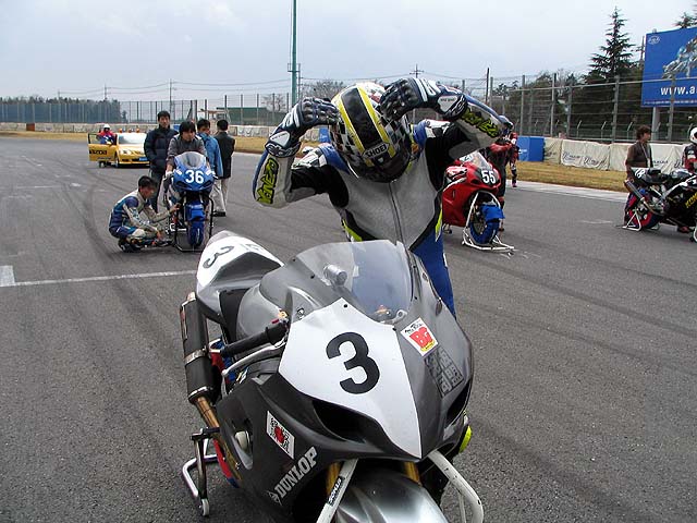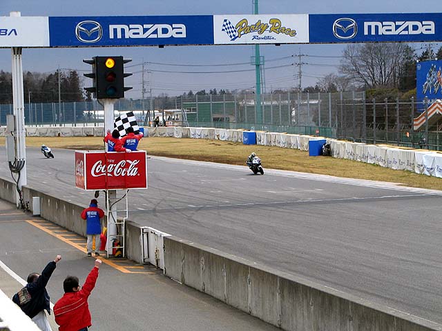 何とか抜かれずにチェッカー。「コケなくて良かった〜」