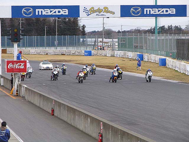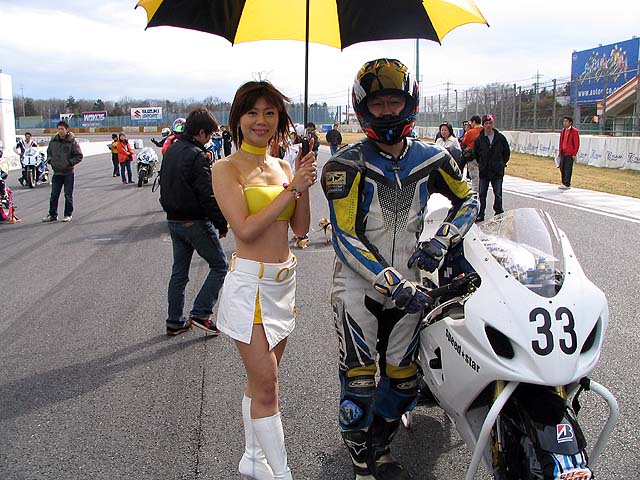 予選待機中に霧が晴れて太陽が出てきてしまった。「あー!せっかくのウエット路面がぁ(号泣)」