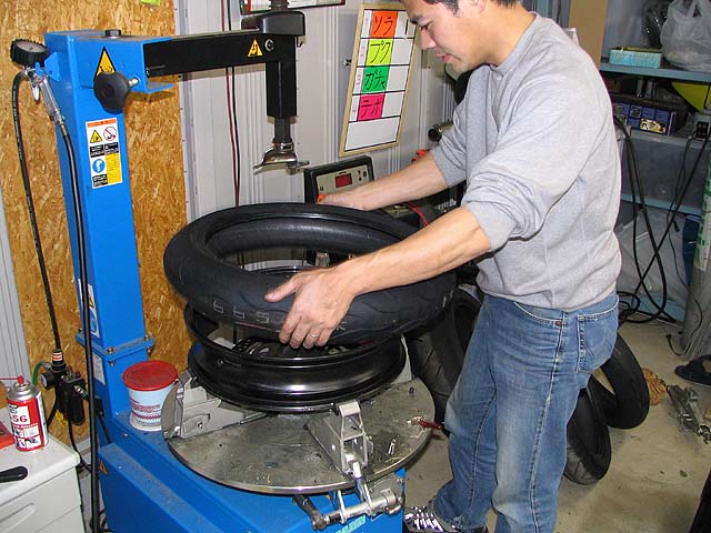 R1000のタイヤを新品に交換。疲れて死にそうなので、残りの整備は明日〜。