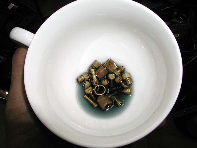 ジェット類を小さめのコーヒーカップに入れてキャブクリーナーに浸し、よくかき混ぜる。