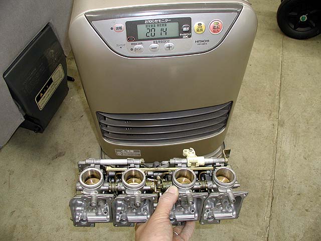 脱脂洗浄剤の気化熱でキャブ本体が冷えて水滴が付いてしまうので、温風で暖めて水滴を乾かす。これをやらないとすぐにまた腐ってしまう