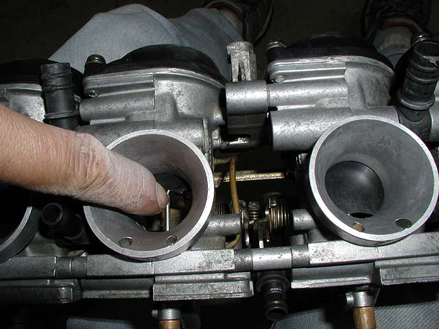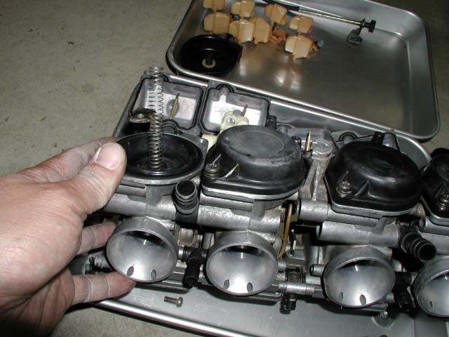 ダイヤフラムを組み立てたら、バキュームピストンがスムーズに動くかチェックする。全開にならないときはスプリングが折れ曲がって引っかかっている