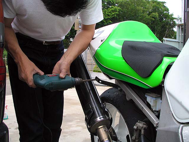 ノーマルマフラーは重いのでJカスタム製チタンエキゾースト(R1000用)をムリヤリ装着。