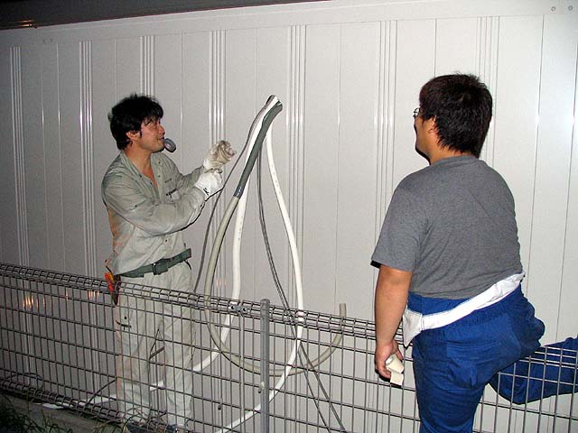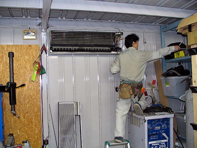 金沢さんがガレージにエアコンを付けに来てくれた。