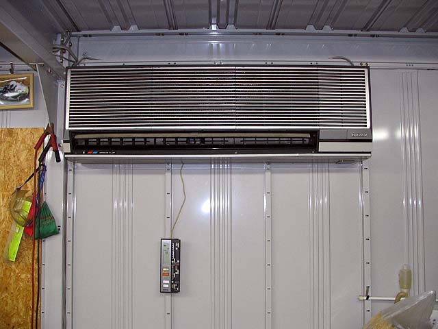完成。外観は小型だけど強力な送風でガレージ全体を寒いくらいに冷やせる。これで快適に整備できるぞ〜!