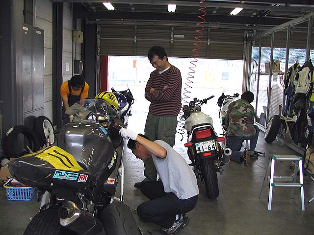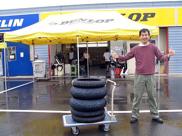 雨なので筑波で拾ったカチカチのレインタイヤに交換。予選が雨になった場合に備えて皮むきをする。