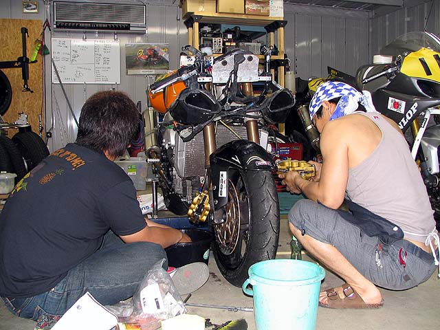 オイル・ブレーキ液を交換。雨の中を走ったのでホイールを外して各部清掃+グリスアップ。作業は深夜まで続きました。