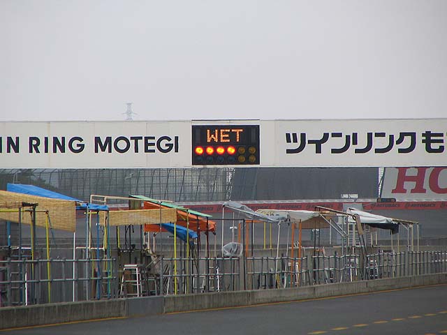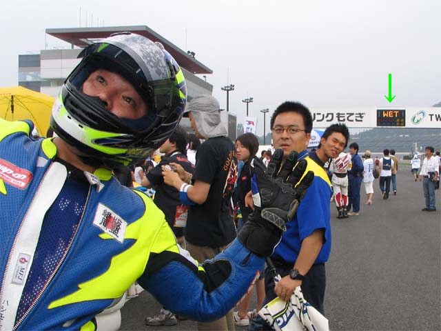 だんだん空が暗くなって雷が鳴り始め、スタート直前にいきなりWET宣言。「マジかよ〜(号泣)」