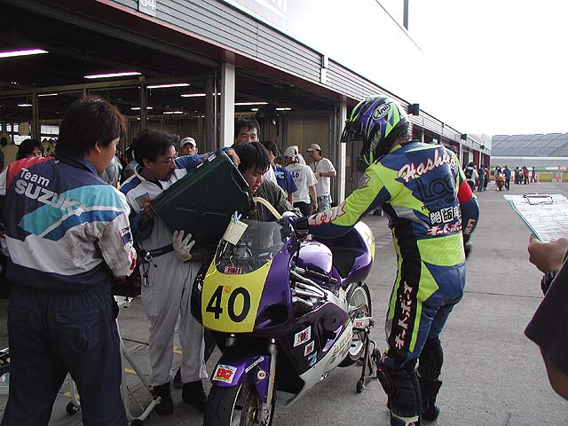 雨が降ると同時にピットインして給油・タイヤ交換する。第二ライダーノアは早めにスタンバイ。
