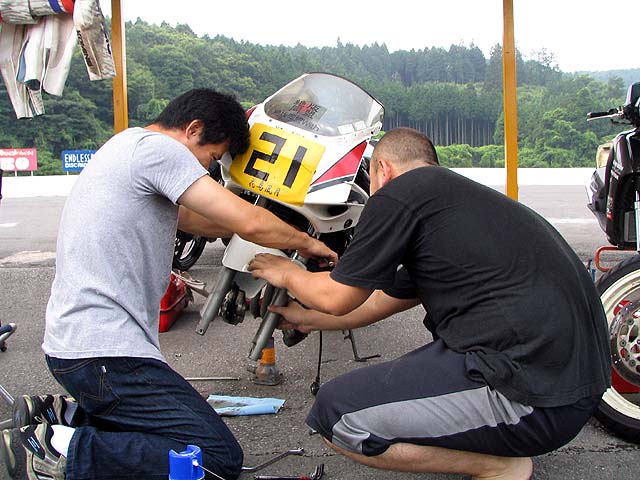マコプリオ夫妻と合流。まずは不動のFZR250マコプリ号を修理する。