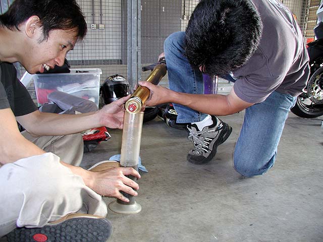 同じ量の新品オイルを注入。これでスプリング外して油面を計らなくてもバッチリだぜ!