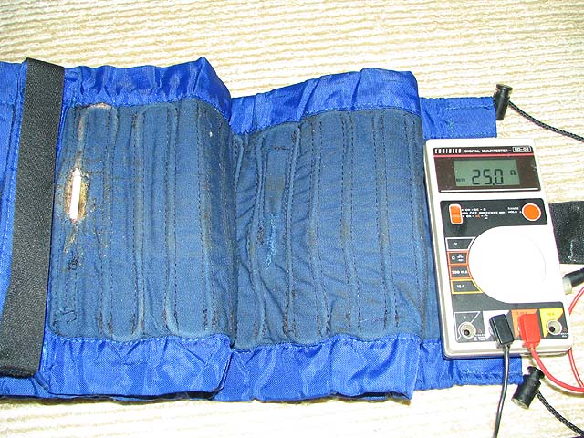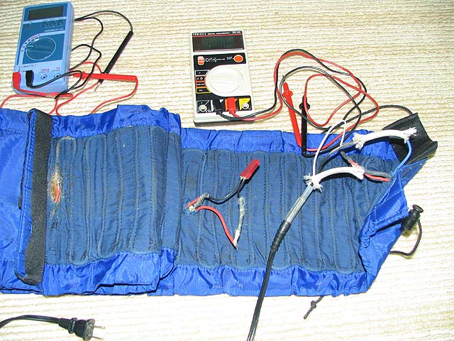 荘さんのタイヤウォーマーを修理。通電ランプが点いているのに暖まらない。断線している場所を探して繋ぎ直す。