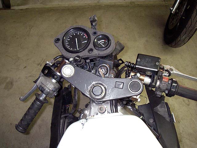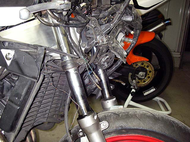 アッパーカウル、ヘッドライト、メーターが粉砕。フォークが前側に曲がってるし。