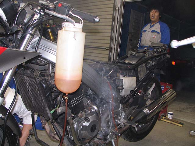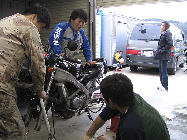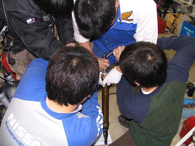 「うおー!早く緩めろー」4人で倒立フォークを分解。