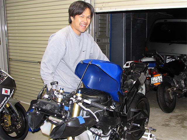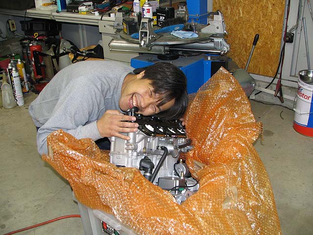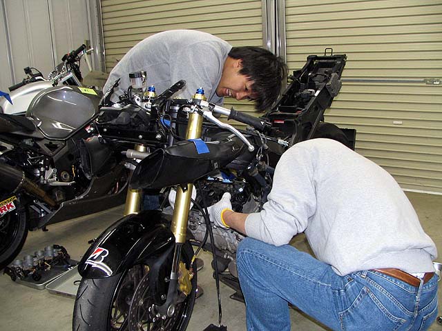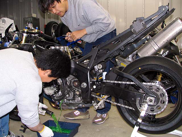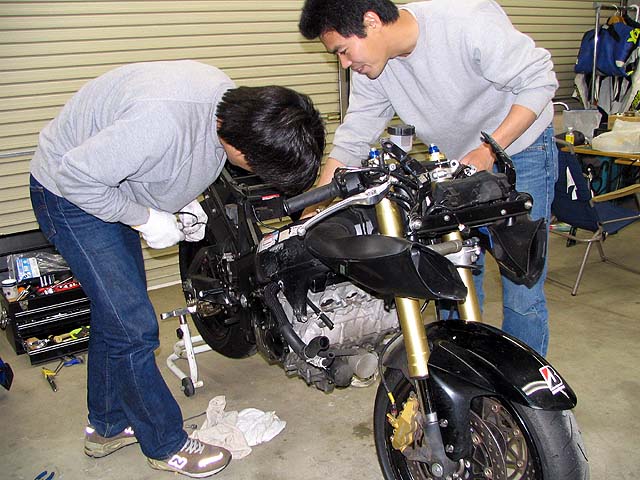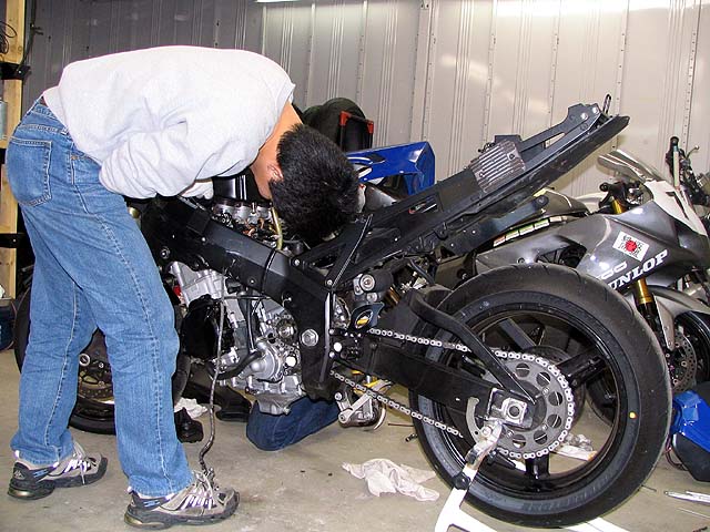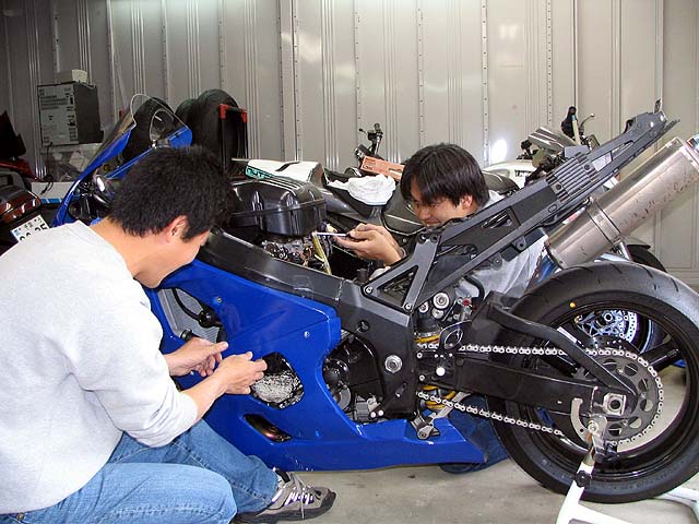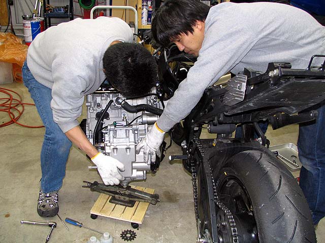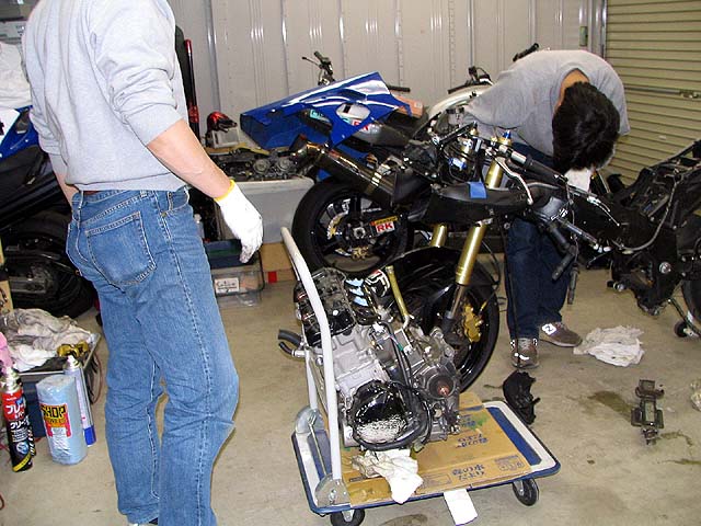 亀石さんがGSXR600と新品エンジンを持って来た。エンジンの載せ替え作業をする。