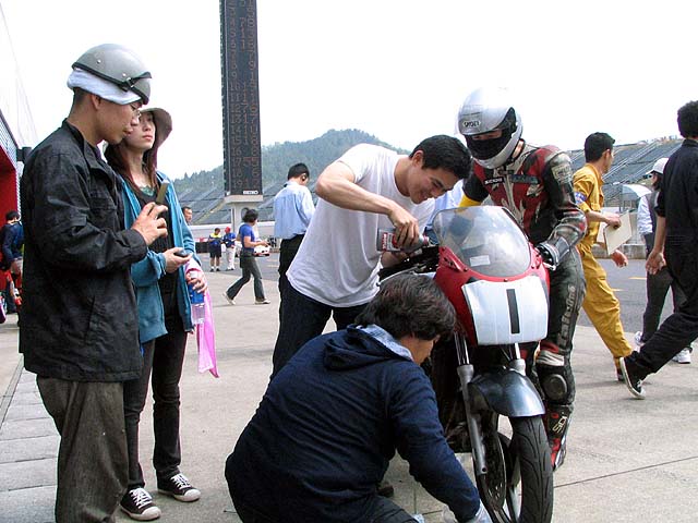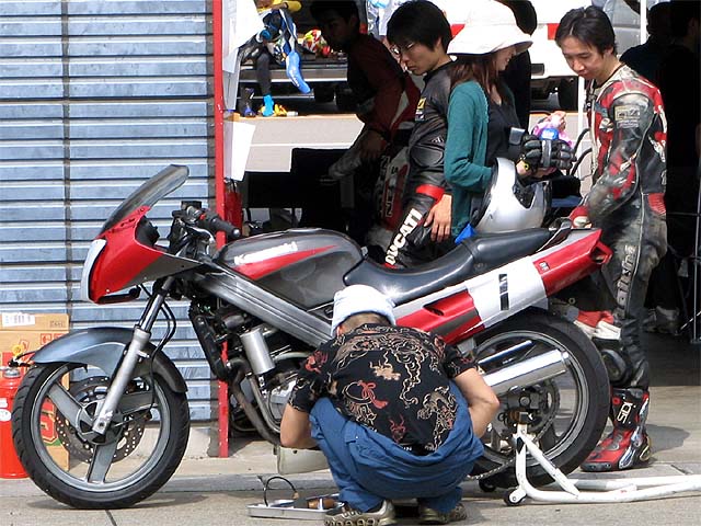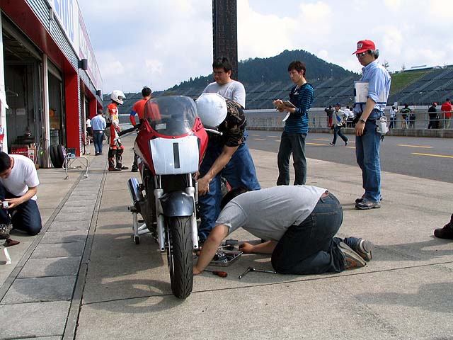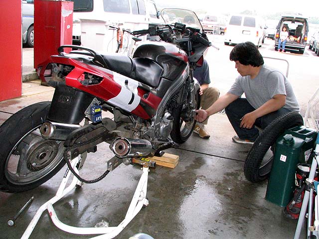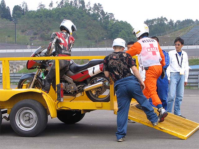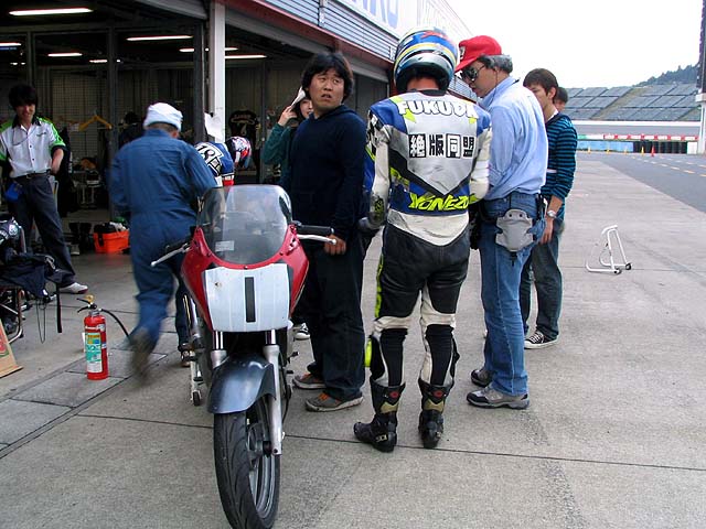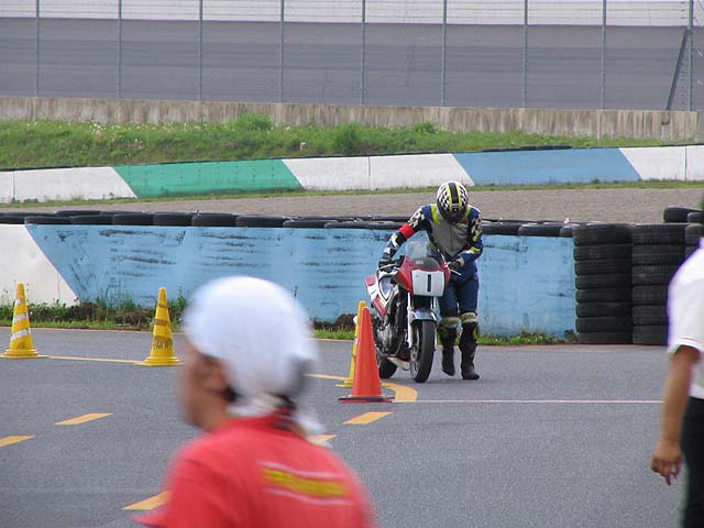 30分後、バイクを押してピットイン。チェーンが外れてタイヤがロック。その後チェーンが切れちゃった。「・・・・しょんぼり」