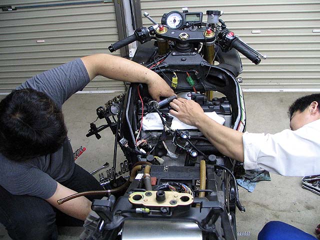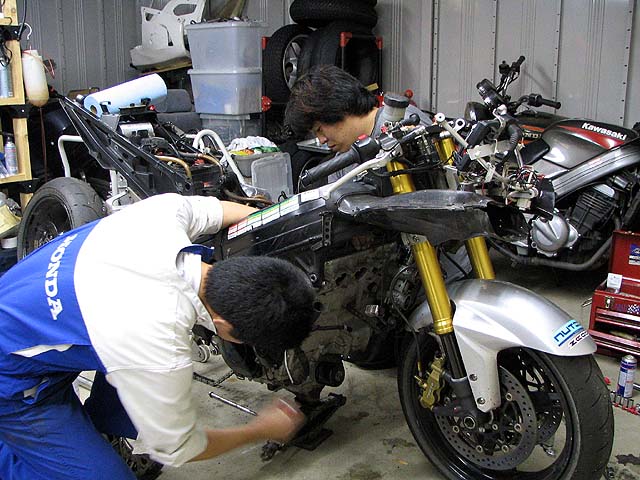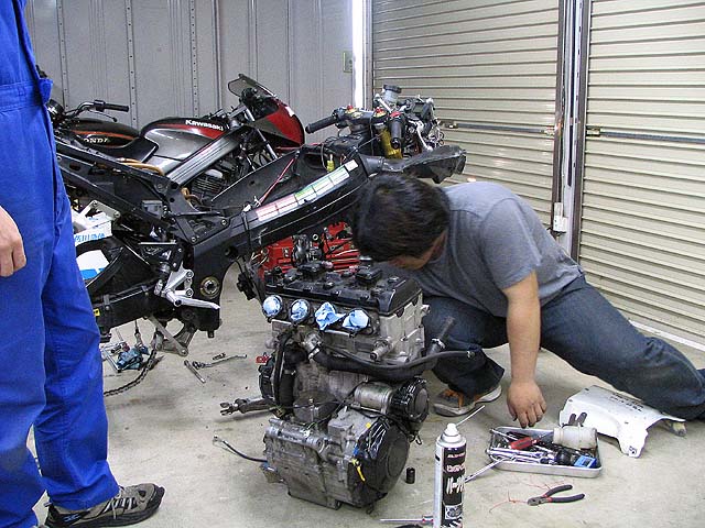 もて耐に向けてGSXR1000を整備。選手権用OH済みエンジンを車体から降ろす。