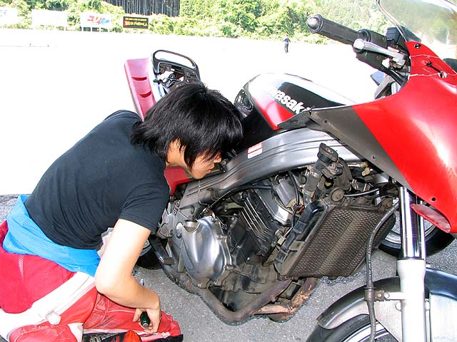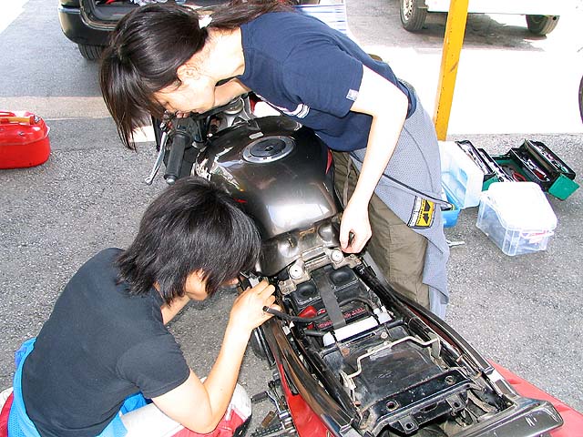 「チョークのリンケージが渋くてレバー戻してもバルブが開いたままになってるねー」タンクを外して修理。