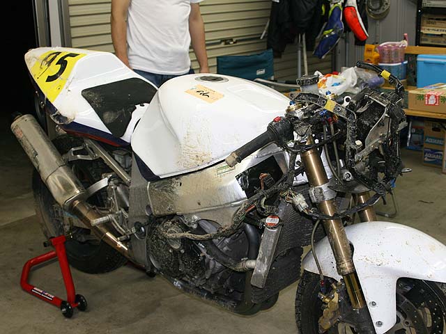もてぎダウンヒル200m看板からにぎりゴケ。転倒したハシモさんは骨折。