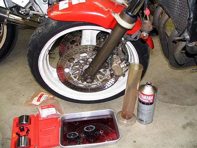 フォークのオイルが漏れていたのでシールを左右交換。サーキット走行するのでブレーキも整備。