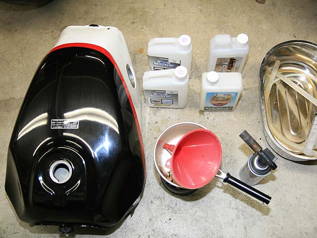 VT250タンクのサビ取りが終わらない。タンクサビ取り剤4本投入してもまだまだ足りない(泣)。